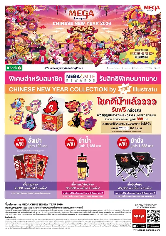 เพิ่มความคุ้มค่าให้ทุกโมเมนต์ของการช้อปปิ้ง เพียงสมัครสมาชิกเมกา สไมล์ รีวอร์ดส พร้อมแสดงใบเสร็จ (ไม่มีขั้นต่ำ) หรือสมาชิกใช้คะแนนเพียง 10 คะแนน รับสิทธิ์เล่นเกมลุ้นรับของรางวัลสุดพิเศษ ได้แก่ “ม้าโน้(ต)” สมุดโน้ตสุดเก๋จาก CHINESE NEW YEAR COLLECTION by TU!! Illustratu มูลค่า 488 บาท, บัตรชมภาพยนตร์จากเมกาซีนีเพล็กซ์ มูลค่า 280 บาท, ผลิตภัณฑ์กันแดด จาก HER HYNESS มูลค่า 250 บาท, MEGA VOUCHER มูลค่า 100 บาท, Unicorn Ice cream มูลค่า 48 บาท จาก IKEA, และ สามารถร่วมกิจกรรมได้ในวันที่ 1, 7-8, 14-17, 21-22 และ 28 ก.พ. 69 ณ บริเวณบูธกิจกรรม ชั้น 1 บริเวณเมน เอนทรานซ์ (หน้าร้าน JASPAL)